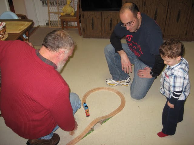 After lunch, James was napping and we decided to watch "Elf," for Dan's parents had never seen it. (I'd totally thrown Dan's mom off by answering the phone, "Buddy the Elf. What's your favorite color?") James woke up mid-movie, so we brought him into the family room to play while we continued the movie. Well, he was NOT a fan of "Elf" at all! He'd break into screaming cries if there was any yelling or physical roughness. And there is lots of both. So, Dan and I took turns chaperoning James in the living room until the movie was over. Oh well!